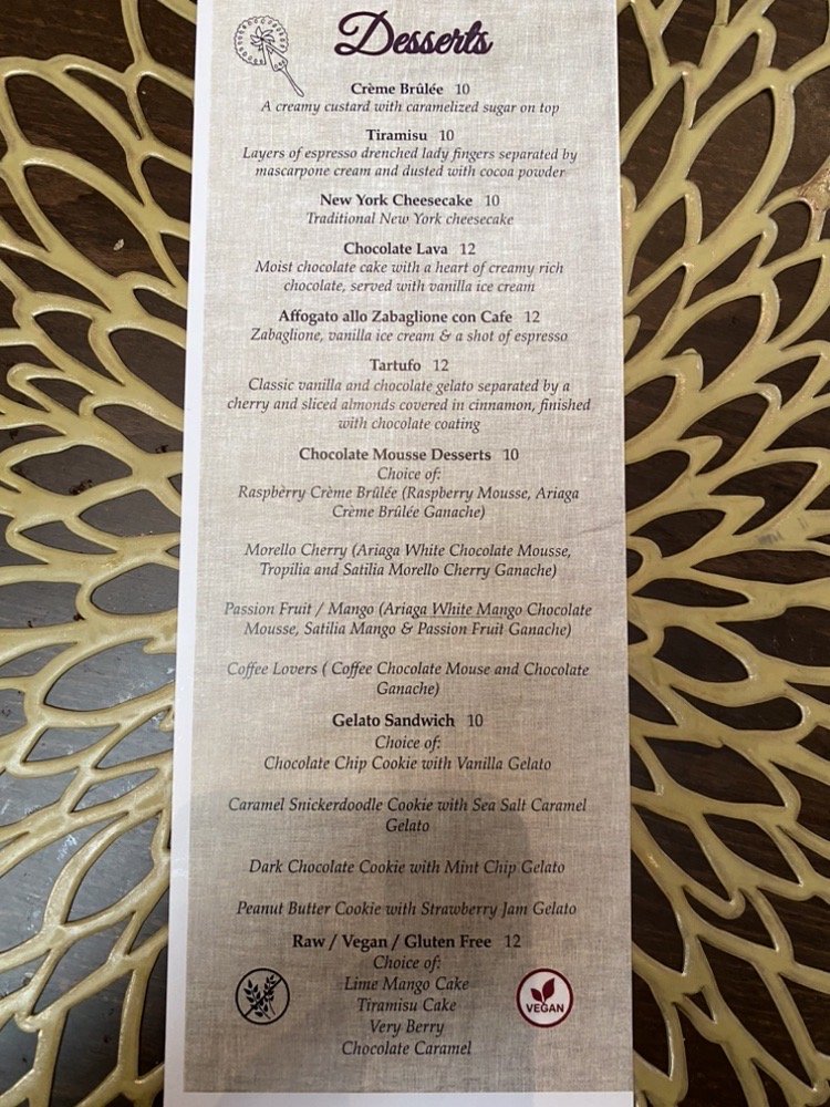 Caesar SaladFocaccia BreadPepperoni Sicilian PizzaRigatoni Boscaiolla Peas, mushrooms & prosciutto cream sauceChoice of one:Chicken Parmigiana or Chicken FranceseMixed Vegetables